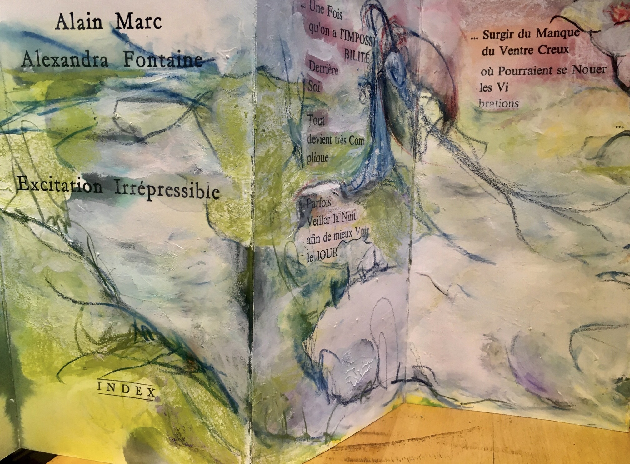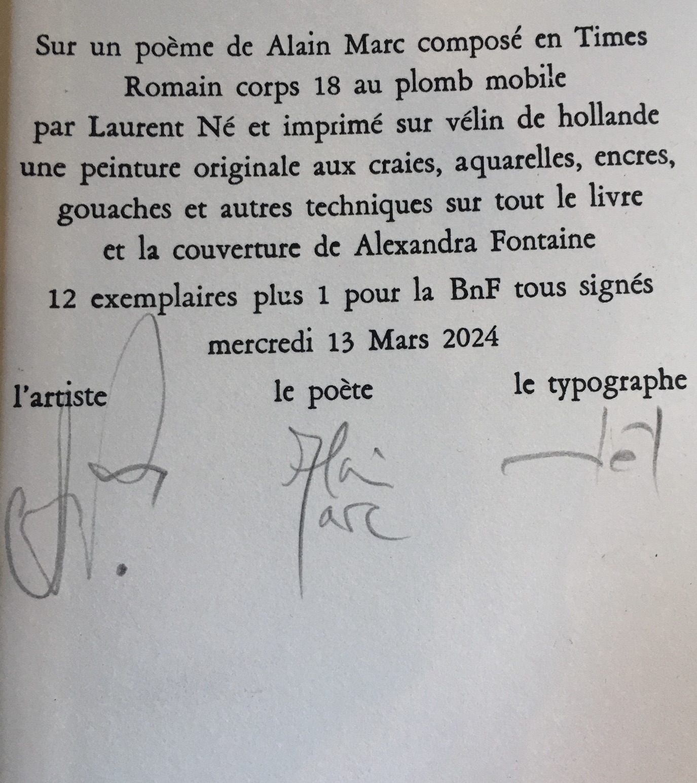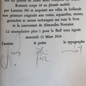 Chaque livre, pensé comme une oeuvre unique offre, dans un carnet à dessins, une peinture d’Alexandra Fontaine et un poème de Bruno Cany.           Achevé d’imprimer sur papier Somerset Antique par François Huin le 22 juillet 2009 à L’Hay-les-Roses . Format 16 X 25 cm