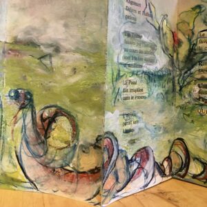 Leporello d’un mètre 20, exemplaire unique avec un cahier texte manuscrit sur papier népalais séparé, signé par l’auteur et par l’artiste